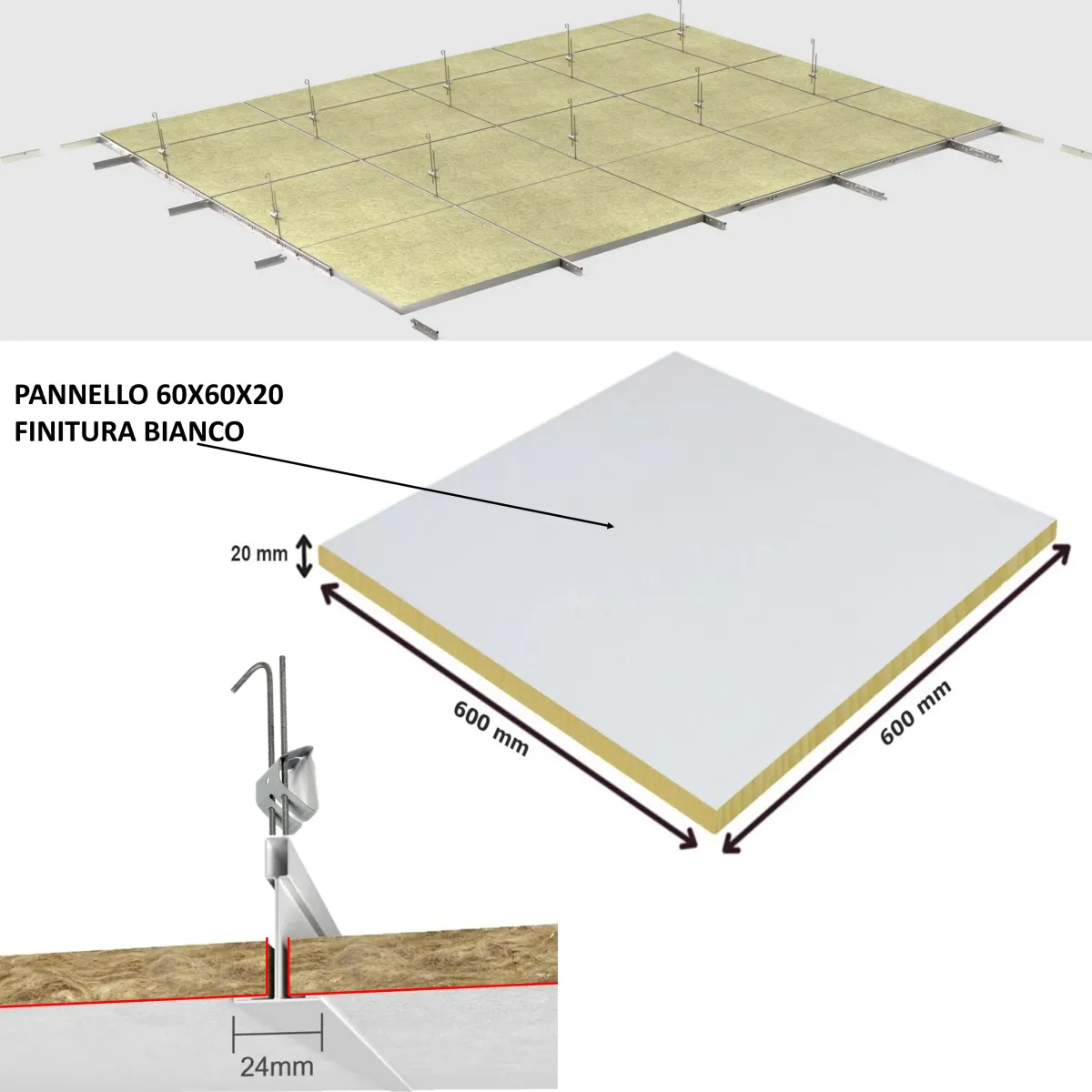 - MATERIALE: Pannelli realizzati in lana minerale IGNIFUGA - Classe A1 - dallo spessore di 2 cm - la struttura di contenimento T24 per pannelli a bordo dritto è realizzata in acciaio zincato e verniciato a polvere bianco completo di agganci ortogonali di intuitivo montaggio