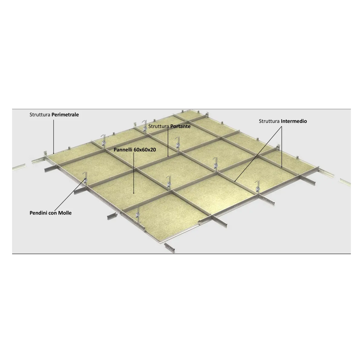 - SISTEMA: Controsoffitto modulare progettato per un'installazione semplice e flessibile con struttura semi-nascosta da ancorare al soffitto pannello 60 x 60 spessore 20 mm. a VISTA trattamento BIANCO o su richiesta colorato. Ideale per : Uffici - Scuole - Case moderne - Spazi commerciali espositivi - Sale convegni - Altro