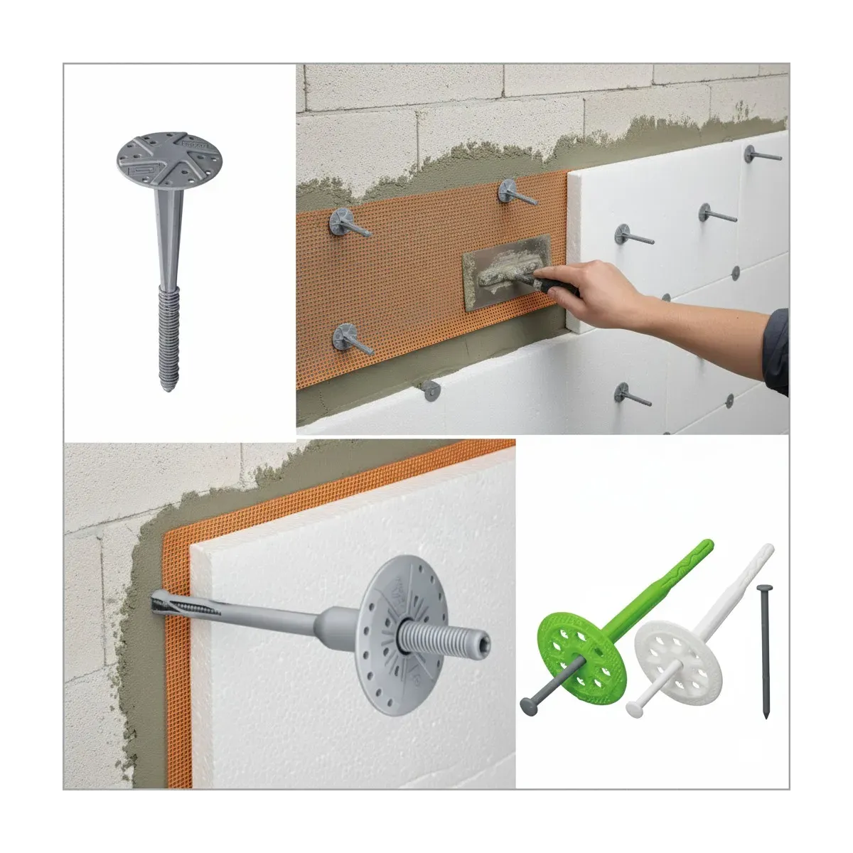 Tassello da cappotto in poliestere con rondella fissa 50 / 60 mm. e spina centrale a precussione , diametro 8/10 mm. lunghezza da 70 a 130 mm. ma disponibili anche in dimensioni maggiori su richiesta .
